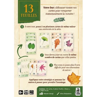 Dans 13 Feuilles, vous devez vous débarrasser de votre main de cartes en premier si vous voulez gagner la partie. Plus vous posez un nombre élevé d’une même valeur, plus il sera difficile pour vos adversaires de suivre. Alors gérez astucieusement votre jeu pour les pousser à passer, sans vous faire prendre à votre propre piège !